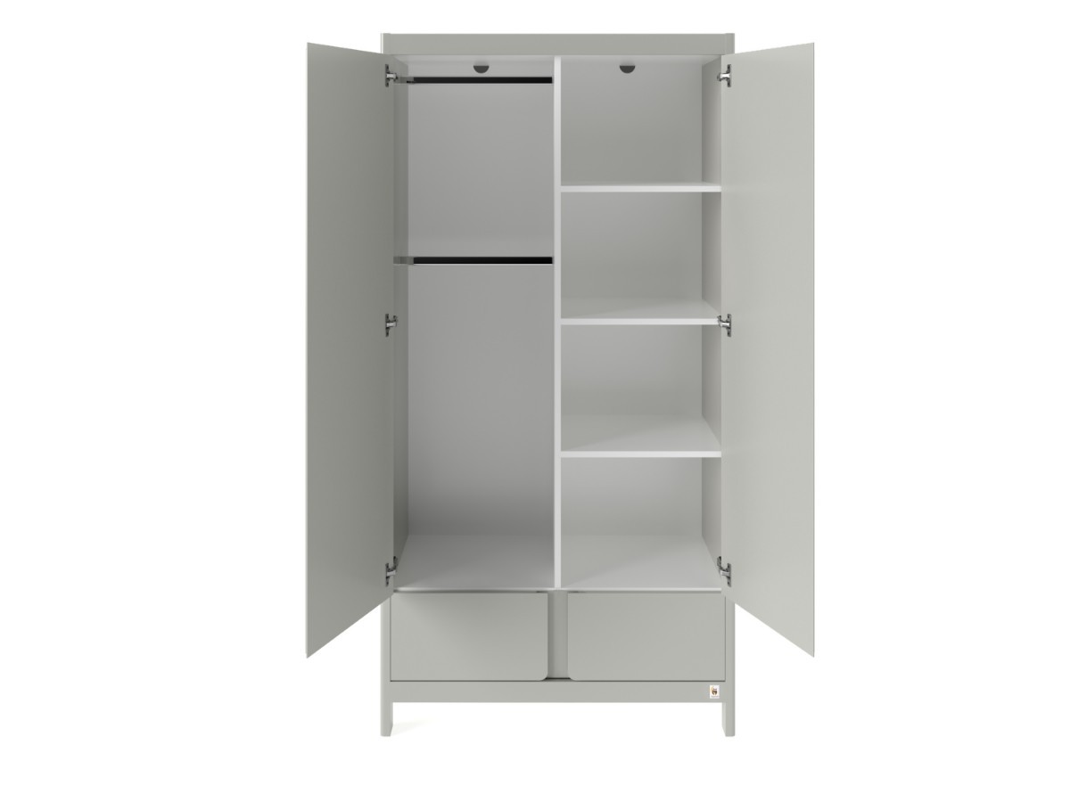 Sisemus on praktiliselt jaotatud: ühel pool on kaks vastupidavat metallist riidepuutorru ning teisel pool riiulid, mis sobivad ideaalselt volditud riiete hoiustamiseks. Soft-close ehk pehmelt sulguv mehhanism tagab, et uksed sulguvad vaikselt ja sujuvalt, kaitstes väikeseid sõrmi.