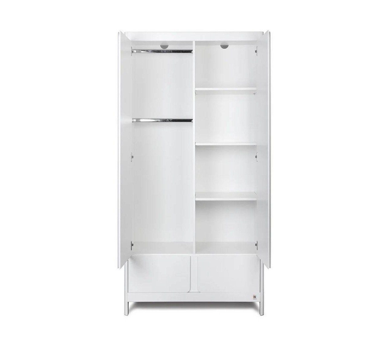 Sisemus on praktiliselt jaotatud: ühel pool on kaks vastupidavat metallist riidepuutorru ning teisel pool riiulid, mis sobivad ideaalselt volditud riiete hoiustamiseks. Soft-close ehk pehmelt sulguv mehhanism tagab, et uksed sulguvad vaikselt ja sujuvalt, kaitstes väikeseid sõrmi.